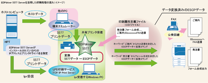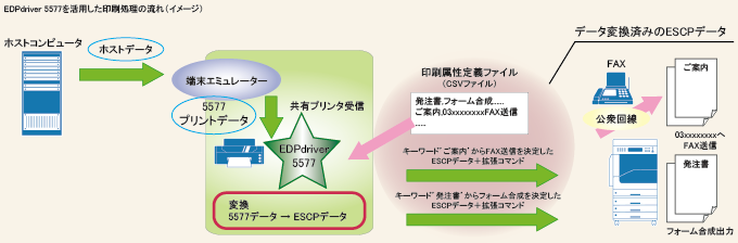 - 端末エミュレーター経由で出力される5577プリンタのデータを、ESCPデータに変換し、