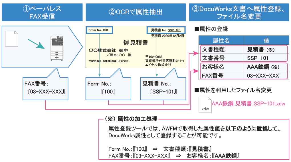 属性登録ツールを利用することで、FAX受信業務において、FAX番号と紐付けた顧客情報やOCR処理、