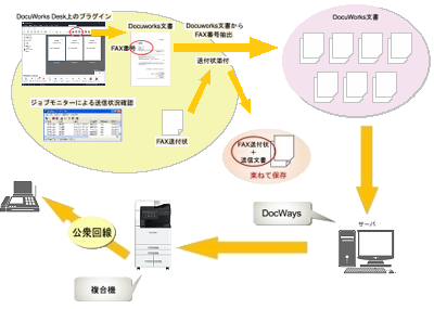 DocuWorks(富士フイルムビジネスイノベーション(株)製文書管理ソフト)文書中の宛先情報を取得し、自動FAX送信を実現します。